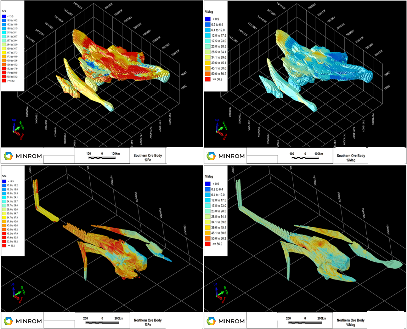 In total, 11,916.82 metres of drilling was done over 105 drill holes with 4,898 samples submitted for chemical analysis. From the initial database, 1500 samples were re-analysed for magnetic content to help improve the accuracy of the model. The geostatistical estimation concentrated on Satmagan models and is based on magnetic iron content. The resultant block models for the Southern and Northern orebodies illustrates the distribution of magnetite and iron content in 3D space (Figure 2). These models provide critical information that allow for effective planning of the next project phases.