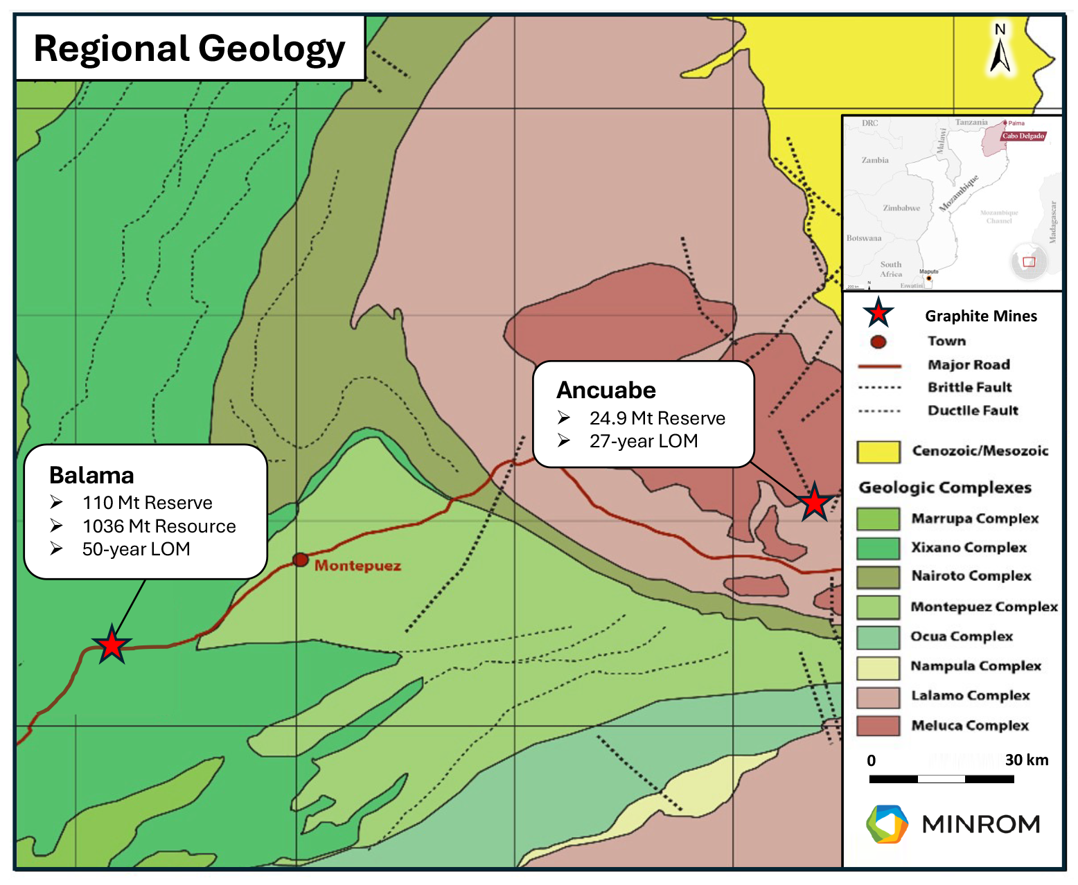 Regional geology of north-eastern Mozambique with locations of Balama and Ancuabe graphite mines indicated.